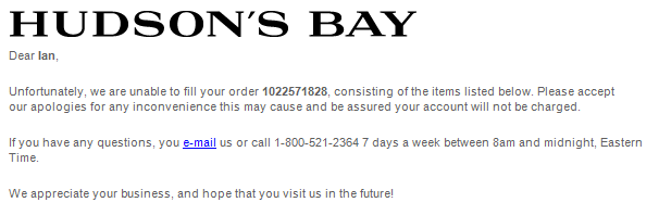 Guess what, HB had cancelled my order! Why? I had no clue as this generic email gave no reason. To make a long story very short, I found out they had a problem with their inventory management system, oversold certain highly discounted items and then turned around and cancelled the orders for all affected customers.